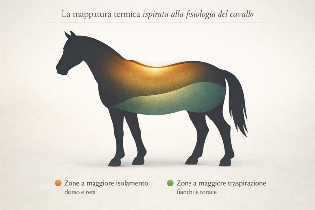 Il corpo del cavallo non disperde il calore in modo uniforme. Alcune aree, come dorso e reni, sono più esposte alla dispersione termica, mentre altre richiedono maggiore ventilazione e traspirabilità.